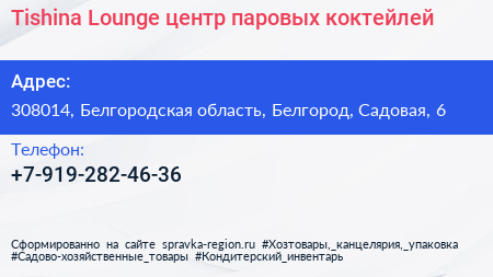 Tishina Lounge, центр паровых коктейлей по адресу 308014, Белгородская область, Белгород, Садовая, 6 в дальнейшем Организация, размещена в следующих категориях: