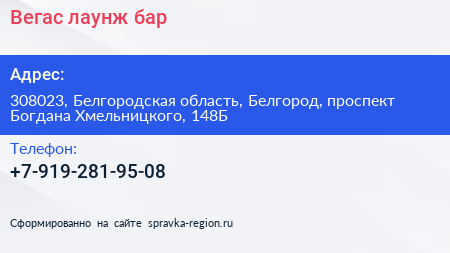 Вегас, лаунж-бар по адресу 308023, Белгородская область, Белгород, проспект Богдана Хмельницкого, 148Б в дальнейшем Организация, размещена в следующих категориях: