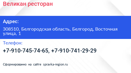 Великан, ресторан по адресу 308510, Белгородская область, Белгород, Восточная улица, 1 в дальнейшем Организация, размещена в следующих категориях: