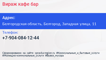 Вираж, кафе-бар по адресу Белгородская область, Белгород, Западная улица, 11 в дальнейшем Организация, размещена в следующих категориях: