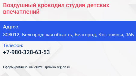 Воздушный крокодил, студия детских впечатлений по адресу 308012, Белгородская область, Белгород, Костюкова, 36Б в дальнейшем Организация, размещена в следующих категориях: