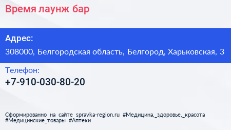 Время, лаунж-бар по адресу 308000, Белгородская область, Белгород, Харьковская, 3 в дальнейшем Организация, размещена в следующих категориях: