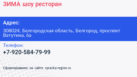 ЗИМА, шоу-ресторан по адресу 308024, Белгородская область, Белгород, проспект Ватутина, 6а в дальнейшем Организация, размещена в следующих категориях: