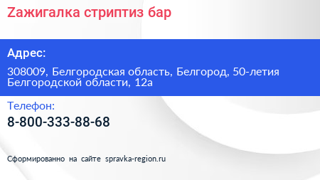 Zажигалка, стриптиз-бар по адресу 308009, Белгородская область, Белгород, 50-летия Белгородской области, 12а в дальнейшем Организация, размещена в следующих категориях: