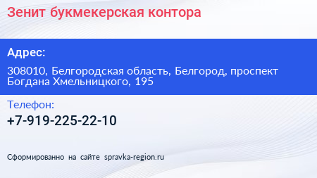Зенит, букмекерская контора по адресу 308010, Белгородская область, Белгород, проспект Богдана Хмельницкого, 195 в дальнейшем Организация, размещена в следующих категориях: