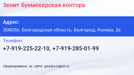 Зенит, букмекерская контора по адресу 308036, Белгородская область, Белгород, Конева, 2а в дальнейшем Организация, размещена в следующих категориях: