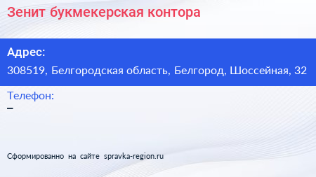 Зенит, букмекерская контора по адресу 308519, Белгородская область, Белгород, Шоссейная, 32 в дальнейшем Организация, размещена в следующих категориях: