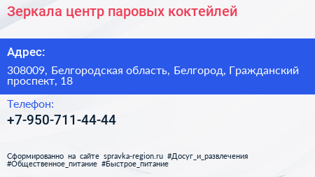 Зеркала, центр паровых коктейлей по адресу 308009, Белгородская область, Белгород, Гражданский проспект, 18 в дальнейшем Организация, размещена в следующих категориях: