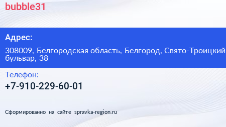 bubble31 по адресу 308009, Белгородская область, Белгород, Свято-Троицкий бульвар, 38 в дальнейшем Организация, размещена в следующих категориях: