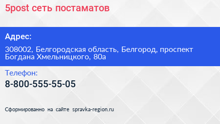 5post, сеть постаматов по адресу 308002, Белгородская область, Белгород, проспект Богдана Хмельницкого, 80а в дальнейшем Организация, размещена в следующих категориях: