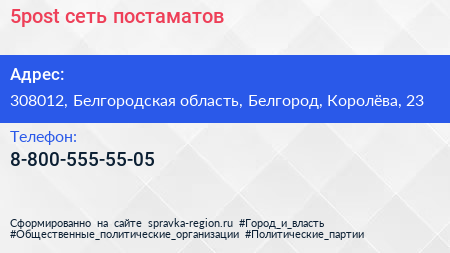 5post, сеть постаматов по адресу 308012, Белгородская область, Белгород, Королёва, 23 в дальнейшем Организация, размещена в следующих категориях: