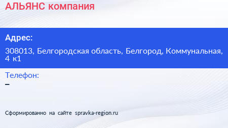 АЛЬЯНС, компания по адресу 308013, Белгородская область, Белгород, Коммунальная, 4 к1 в дальнейшем Организация, размещена в следующих категориях: