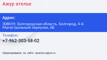 Ажур, ателье по адресу 308019, Белгородская область, Белгород, 4-й Магистральный переулок, 6Б в дальнейшем Организация, размещена в следующих категориях:
