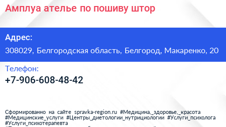 Амплуа, ателье по пошиву штор по адресу 308029, Белгородская область, Белгород, Макаренко, 20 в дальнейшем Организация, размещена в следующих категориях: