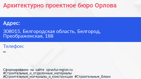 Архитектурно-проектное бюро Орлова по адресу 308015, Белгородская область, Белгород, Преображенская, 188 в дальнейшем Организация, размещена в следующих категориях: