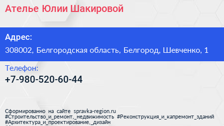 Ателье Юлии Шакировой по адресу 308002, Белгородская область, Белгород, Шевченко, 1 в дальнейшем Организация, размещена в следующих категориях: