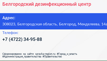 Белгородский дезинфекционный центр по адресу 308023, Белгородская область, Белгород, Менделеева, 14а в дальнейшем Организация, размещена в следующих категориях: