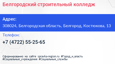 Белгородский строительный колледж по адресу 308024, Белгородская область, Белгород, Костюкова, 13 в дальнейшем Организация, размещена в следующих категориях: