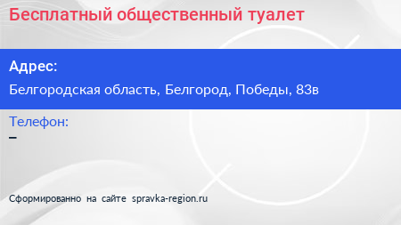 Бесплатный общественный туалет по адресу Белгородская область, Белгород, Победы, 83в в дальнейшем Организация, размещена в следующих категориях: