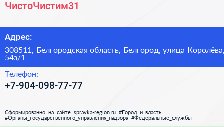 ЧистоЧистим31 по адресу 308511, Белгородская область, Белгород, улица Королёва, 54з/1 в дальнейшем Организация, размещена в следующих категориях: