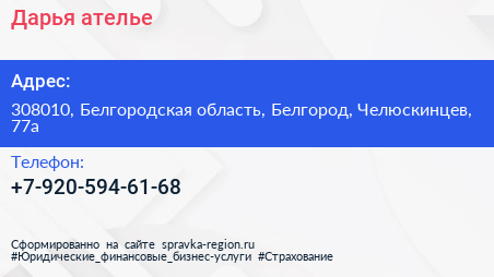 Дарья, ателье по адресу 308010, Белгородская область, Белгород, Челюскинцев, 77а в дальнейшем Организация, размещена в следующих категориях: