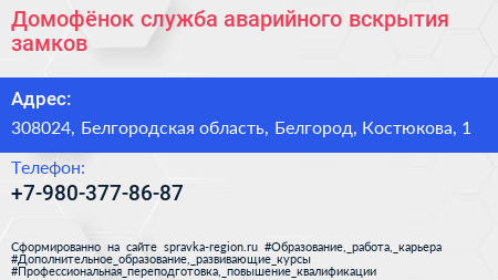 Домофёнок, служба аварийного вскрытия замков по адресу 308024, Белгородская область, Белгород, Костюкова, 1 в дальнейшем Организация, размещена в следующих категориях: