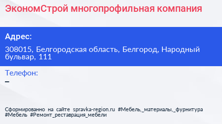 ЭкономСтрой, многопрофильная компания по адресу 308015, Белгородская область, Белгород, Народный бульвар, 111 в дальнейшем Организация, размещена в следующих категориях: