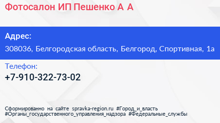 Фотосалон, ИП Пешенко А.А. по адресу 308036, Белгородская область, Белгород, Спортивная, 1а в дальнейшем Организация, размещена в следующих категориях: