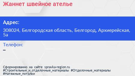 Жаннет, швейное ателье по адресу 308024, Белгородская область, Белгород, Архиерейская, 5а в дальнейшем Организация, размещена в следующих категориях:
