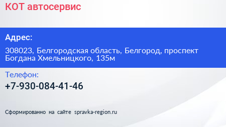 КОТ, автосервис по адресу 308023, Белгородская область, Белгород, проспект Богдана Хмельницкого, 135м в дальнейшем Организация, размещена в следующих категориях: