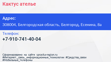 Кактус, ателье по адресу 308004, Белгородская область, Белгород, Есенина, 8а в дальнейшем Организация, размещена в следующих категориях:
