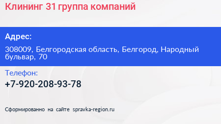Клининг 31, группа компаний по адресу 308009, Белгородская область, Белгород, Народный бульвар, 70 в дальнейшем Организация, размещена в следующих категориях: