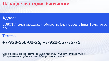 Лавандель, студия биочистки по адресу 308019, Белгородская область, Белгород, Льва Толстого, 55 в дальнейшем Организация, размещена в следующих категориях: