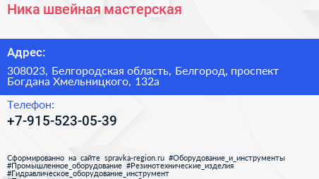 Ника, швейная мастерская по адресу 308023, Белгородская область, Белгород, проспект Богдана Хмельницкого, 132а в дальнейшем Организация, размещена в следующих категориях: