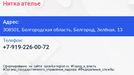 Нитка, ателье по адресу 308501, Белгородская область, Белгород, Зелёная, 13 в дальнейшем Организация, размещена в следующих категориях: