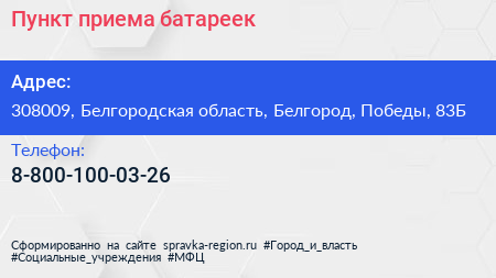 Пункт приема батареек по адресу 308009, Белгородская область, Белгород, Победы, 83Б в дальнейшем Организация, размещена в следующих категориях: