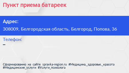 Пункт приема батареек по адресу 308009, Белгородская область, Белгород, Попова, 36 в дальнейшем Организация, размещена в следующих категориях: