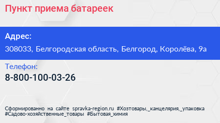 Пункт приема батареек по адресу 308033, Белгородская область, Белгород, Королёва, 9а в дальнейшем Организация, размещена в следующих категориях: