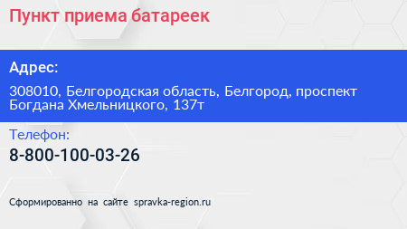 Пункт приема батареек по адресу 308010, Белгородская область, Белгород, проспект Богдана Хмельницкого, 137т в дальнейшем Организация, размещена в следующих категориях: