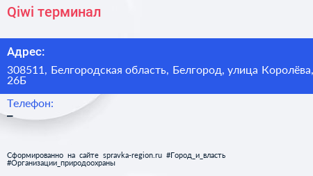 Qiwi, терминал по адресу 308511, Белгородская область, Белгород, улица Королёва, 26Б в дальнейшем Организация, размещена в следующих категориях: