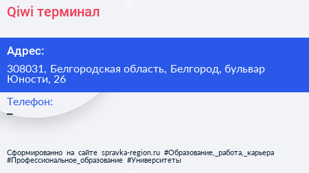 Qiwi, терминал по адресу 308031, Белгородская область, Белгород, бульвар Юности, 26 в дальнейшем Организация, размещена в следующих категориях: