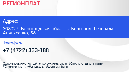РЕГИОНПЛАТ по адресу 308027, Белгородская область, Белгород, Генерала Апанасенко, 56 в дальнейшем Организация, размещена в следующих категориях: