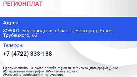 РЕГИОНПЛАТ по адресу 308001, Белгородская область, Белгород, Князя Трубецкого, 62 в дальнейшем Организация, размещена в следующих категориях: