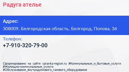 Радуга, ателье по адресу 308009, Белгородская область, Белгород, Попова, 36 в дальнейшем Организация, размещена в следующих категориях: