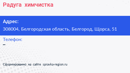 Радуга+, химчистка по адресу 308004, Белгородская область, Белгород, Щорса, 51 в дальнейшем Организация, размещена в следующих категориях: