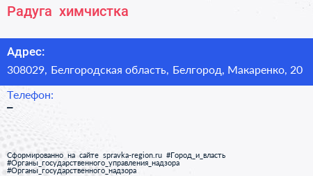 Радуга+, химчистка по адресу 308029, Белгородская область, Белгород, Макаренко, 20 в дальнейшем Организация, размещена в следующих категориях: