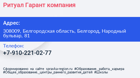 Ритуал Гарант, компания по адресу 308009, Белгородская область, Белгород, Народный бульвар, 81 в дальнейшем Организация, размещена в следующих категориях: