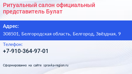 Ритуальный салон, официальный представитель Булат по адресу 308501, Белгородская область, Белгород, Звёздная, 9 в дальнейшем Организация, размещена в следующих категориях: