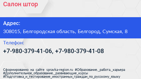 Салон штор по адресу 308015, Белгородская область, Белгород, Сумская, 8 в дальнейшем Организация, размещена в следующих категориях:
