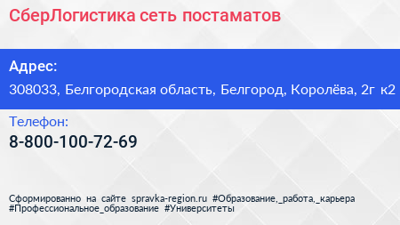СберЛогистика, сеть постаматов по адресу 308033, Белгородская область, Белгород, Королёва, 2г к2 в дальнейшем Организация, размещена в следующих категориях: